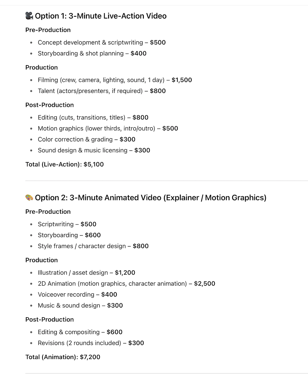 Here are estimates for costs of a traditional video production and 2D animation. Video tends to be boring and animations are typically done by cartoonists who don’t understand the nuances and importance of a one-time only legacy animation.